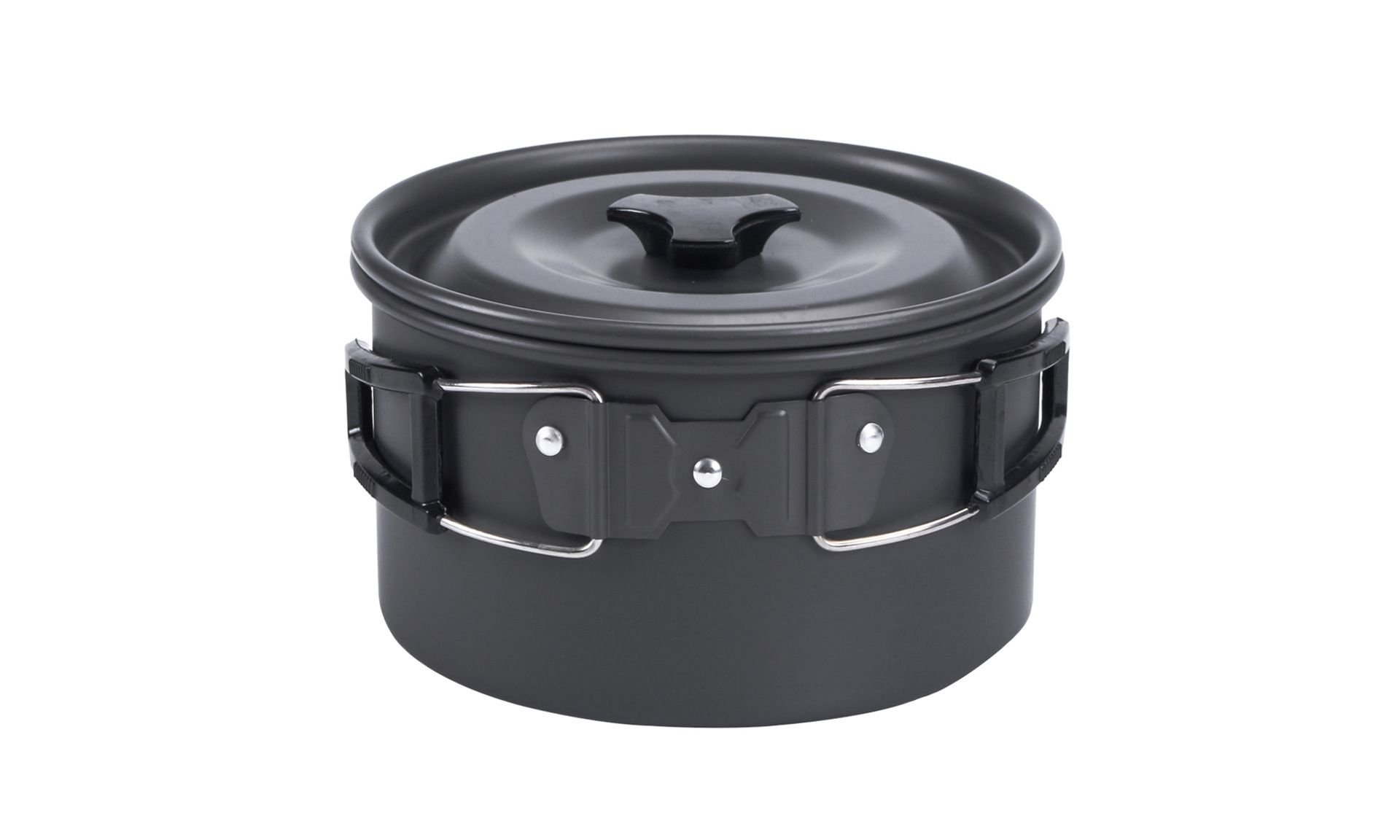 Suitable for 2-3 people; including a large pot; a frying pan; a teapot; two 304 stainless steel cups; a fork; a spoon; a knife; a lock; the pot set is made of aluminum alloy; which has been treated with high-grade hard. High temperature and friction resistance. Knives; forks and spoons are made of 410 stainless steel. Selected 304 stainless steel water cup; specially customized; can be put into the teapot; easy to carry.