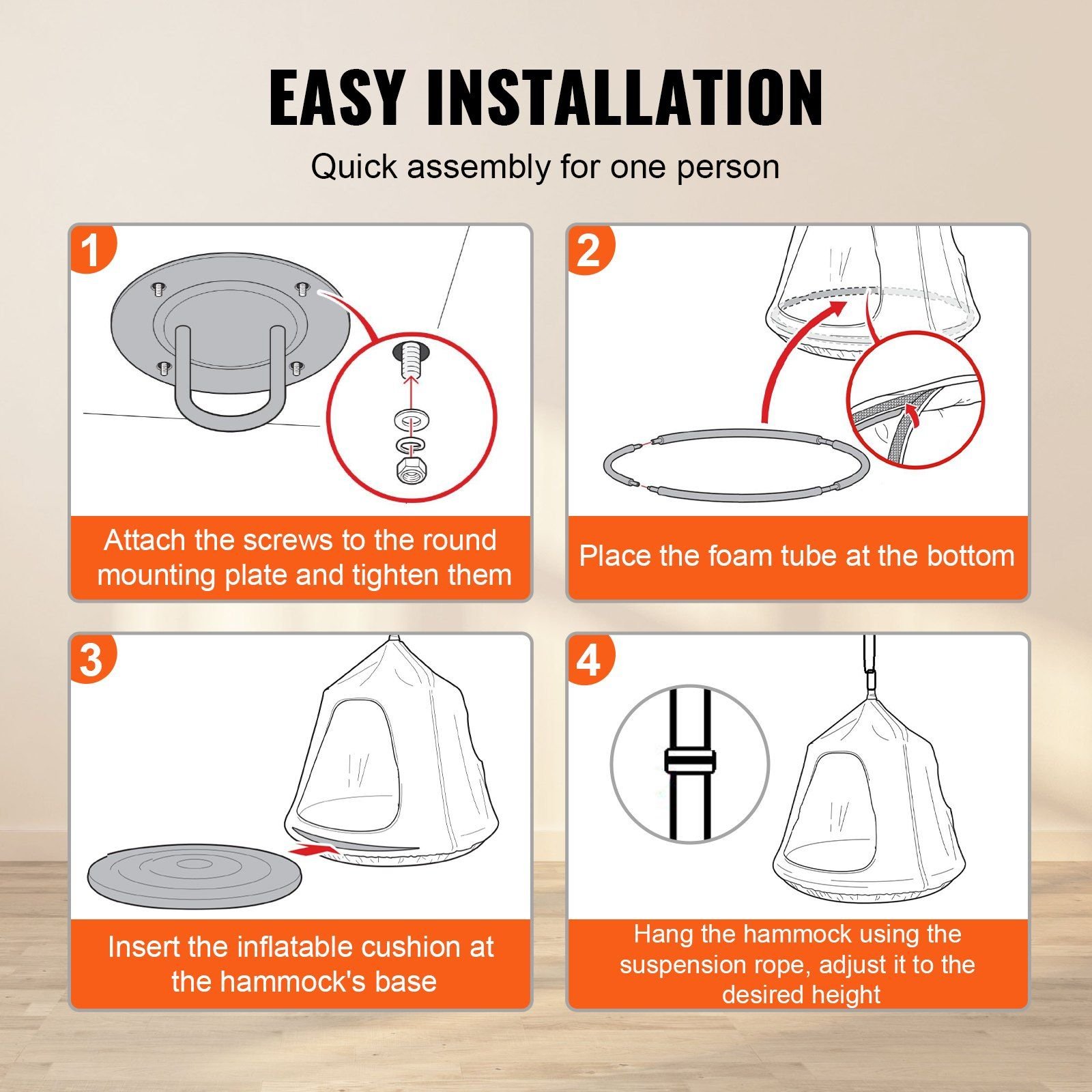 3.Spacious and Comfortable: The 39x39x52 inch hammock swing provides enough space for up to 3 kids. An inflatable cushion is included at the bottom of the tent, and a foam shaping tube is added to the steel ring, providing a soft and comfortable experience. It also features 2 peek-a-boo windows, allowing kids to look out from any angle.
