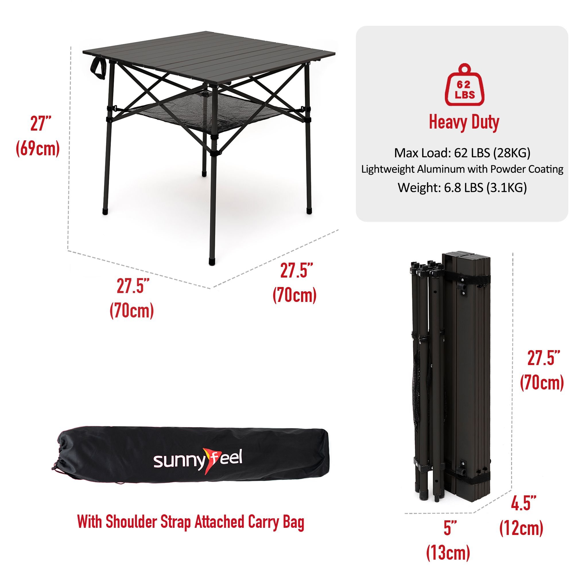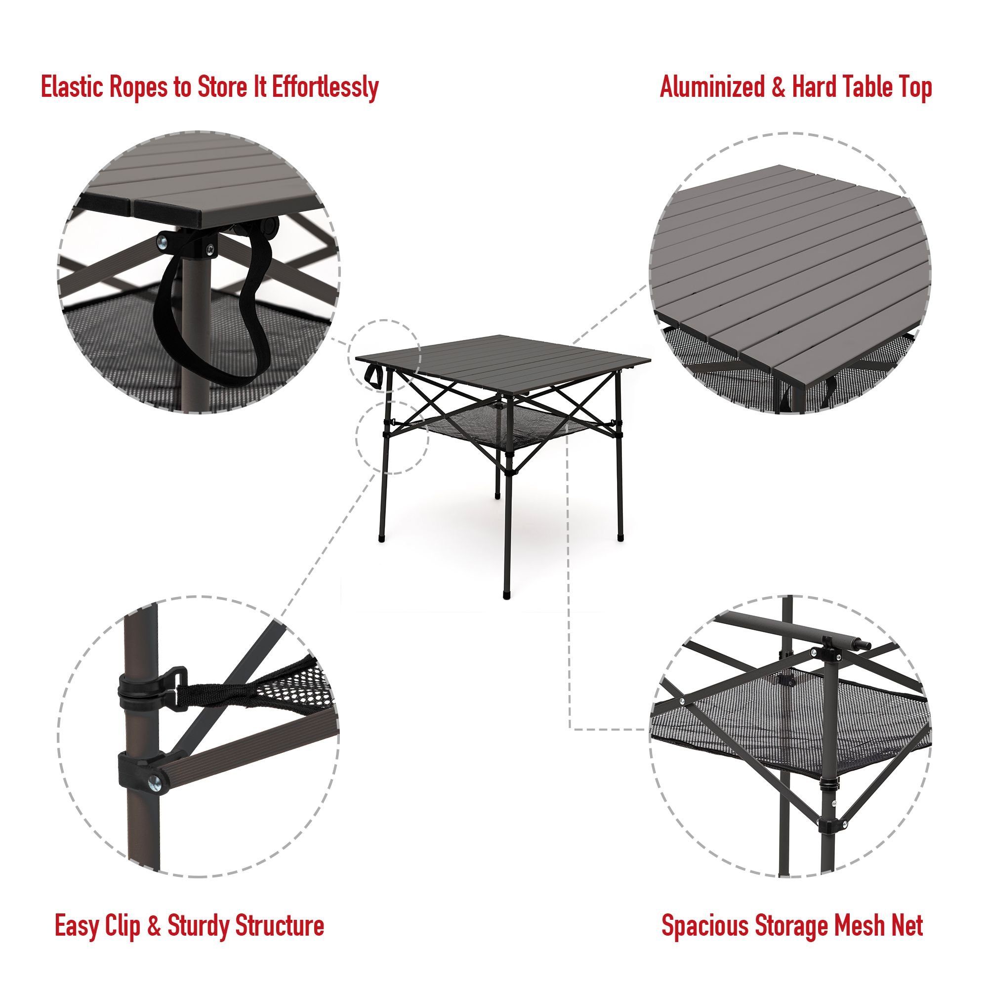 Extremely Lightweight & Convenient: The size of lightweight & sturdy aluminum folding camping table is 27.5"x27.5"x27" and weights only 6.8 LBS (3.1KG), providing the great convenience for you to travel around. The attached mesh net offers additional spacious storage for you to store your drinks, food, and other stuff.