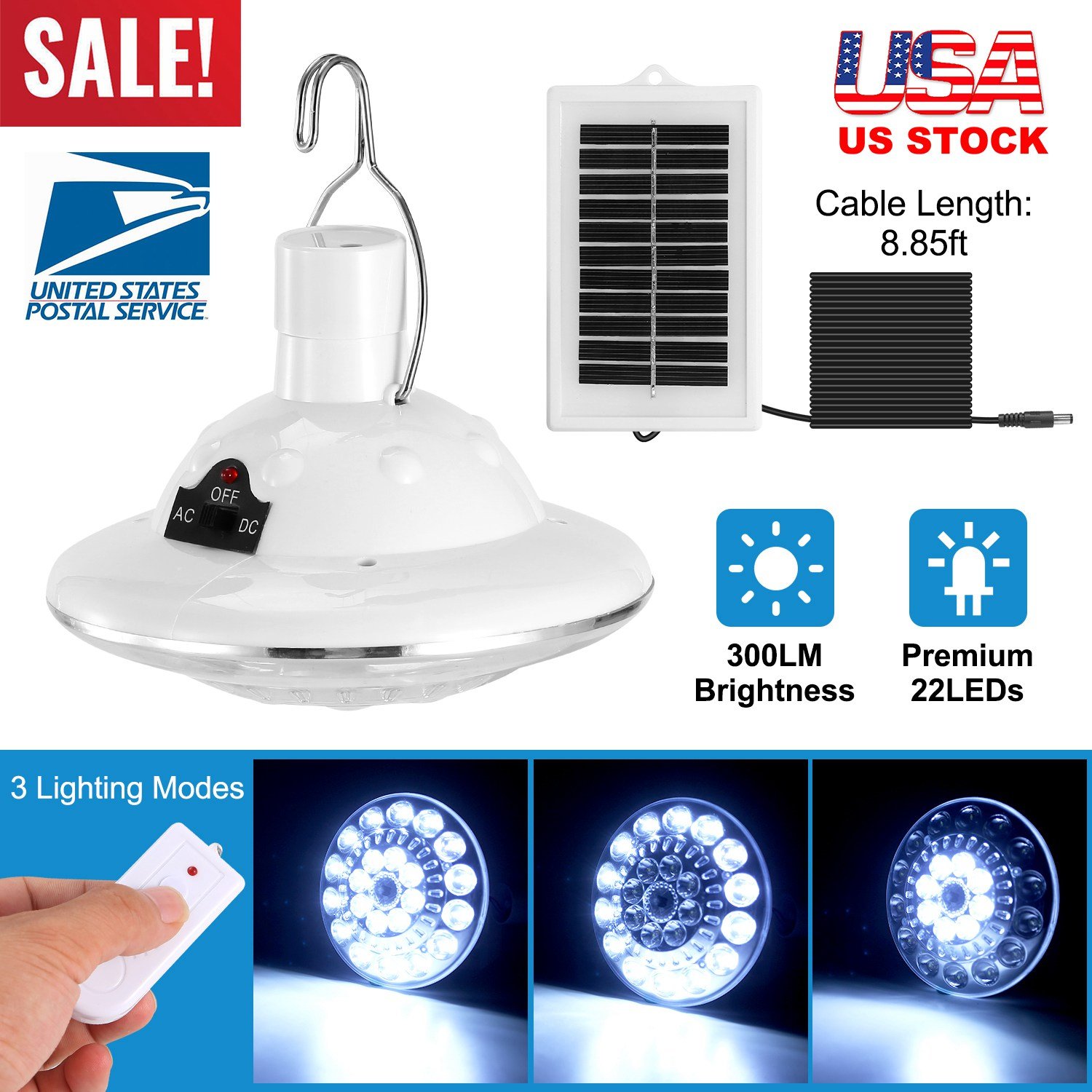 Adopting premium 22pcs straw hat beads and high light-transmitting lampshade, our LED light lamp can provide super bright illumination (300lm brightness and 6500K color temperature) for illumination of outdoor activities such as camping, hiking, fishing, etc. courtyard, patio, balcony, garden, poultry shed and some emergencies. It comes with a sensitive remote control which can offer up to 9.84ft wireless remote control distance to realize 3 lighting modes (22LEDs light up mode, 14 LEDs light up mode and 8LEDs light up mode) to meet different illumination needs. Additionally, it has two charging methods energy-saving solar powered and AC charger powered method. And built-in 1000mAh rechargeable battery, it can illuminate approx. 8 hours after 7-10 hours direct sunlight charge and around 6 hours after 3 hours AC charger charge.