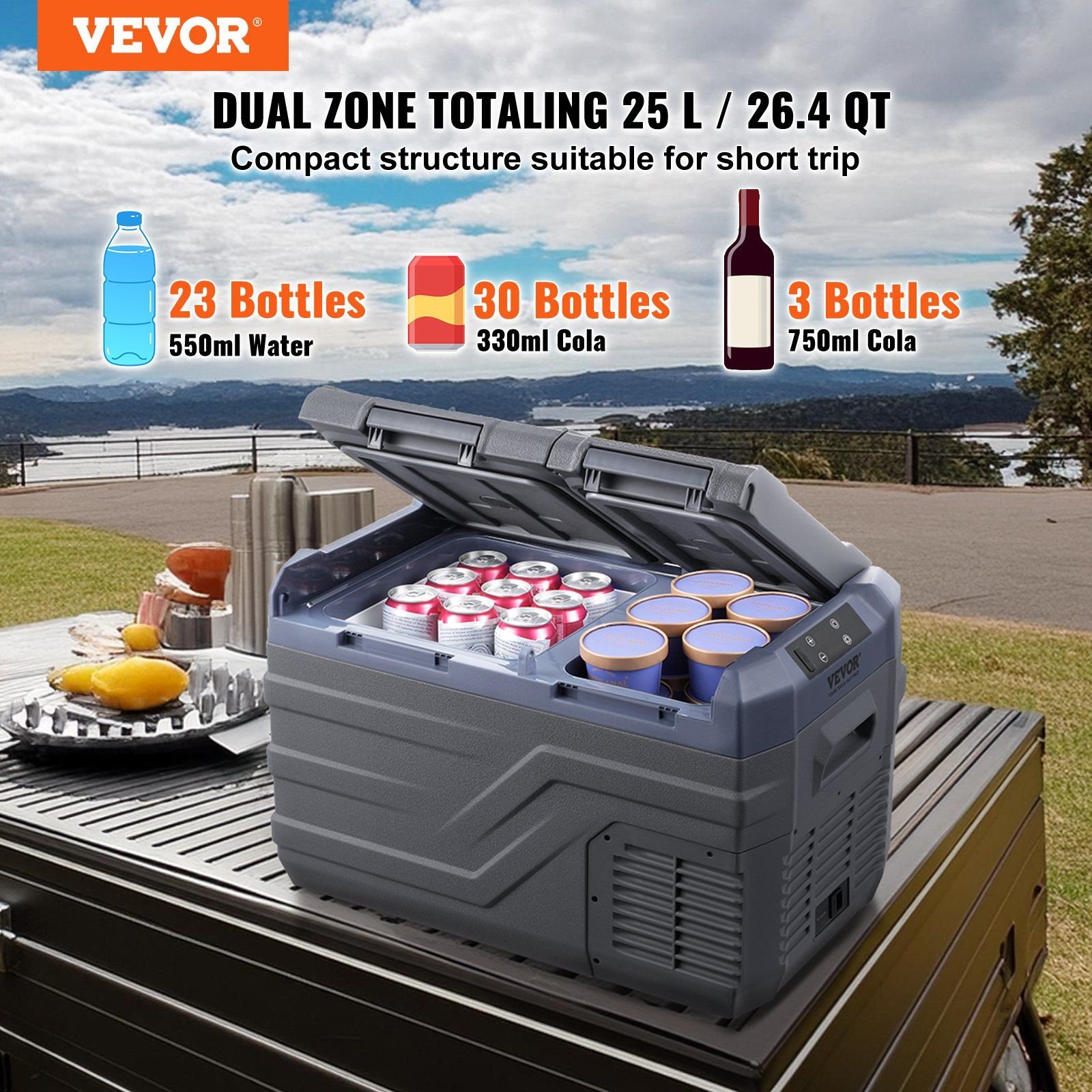 1.Large Capacity: The portable refrigerator freezer has a dual compartment capacity of 25 L. This robust RV fridge can hold 30 cans of 330ml cola or 23 bottles of 550ml water or 3 bottles of 750ml red wine, accommodating seafood, snacks, meats, and beverages, meeting the needs of short trips such as travel, boating, and camping.